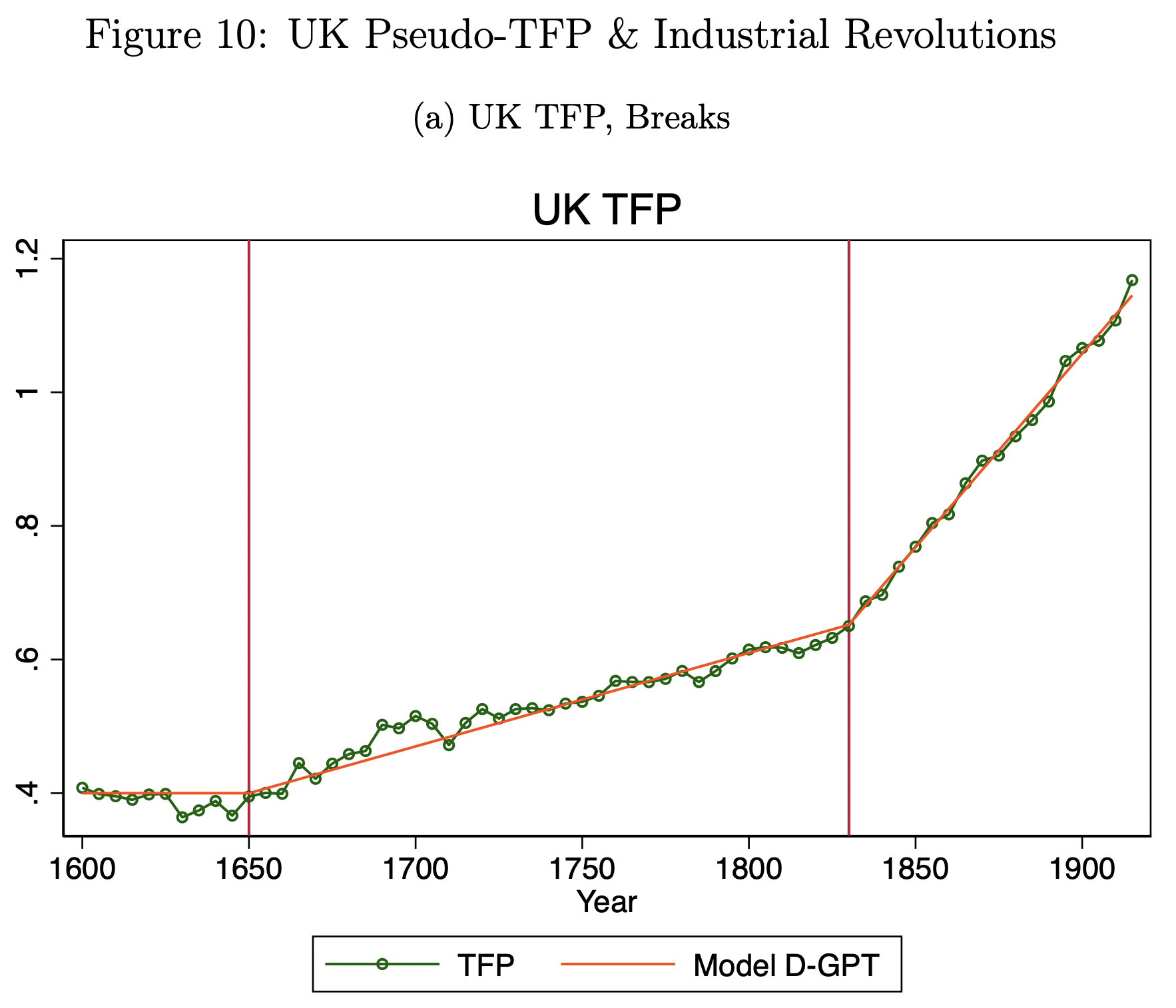 The breaks are determined via statistical tests, but they are presumed to represent general-purpose technologies (GPTs). The 1930s were a turning point in electrification, especially of factories; 1830 was the beginning of railroads and the Second Industrial Revolution. 1650 seems less clear; it might be due to rising labor input that is not accounted for in the calculations, or to the rise of cottage industry.