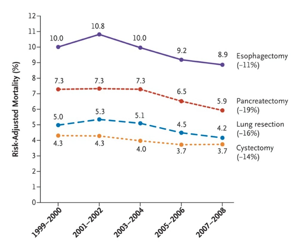 Operative mortality for eight different cancer and cardiovascular operations from 1999 through 2008 declined with the lowest decline being 8% and the highest at 36%.
