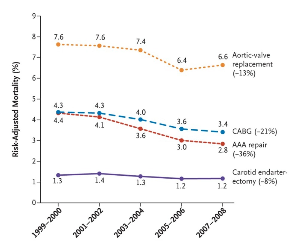Operative mortality for eight different cancer and cardiovascular operations from 1999 through 2008 declined with the lowest decline being 8% and the highest at 36%.