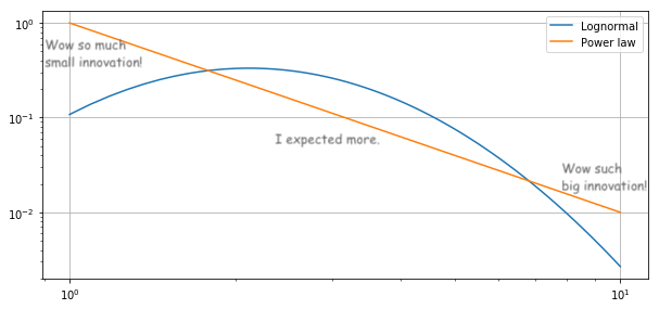 If the impact of innovations followed a power-law distribution, that would explain a lot. Power laws often seem like a two process distribution because we notice the small outcomes (frequent!) and we notice the really big outcomes (really big!). Our instincts tell us to expect outcomes to be more Gaussian but the probability of a power law outcome is higher than a Gaussian in both the tail and in the head of the distribution. We’d expect people to be underwhelmed by the middle of the distribution.[2]