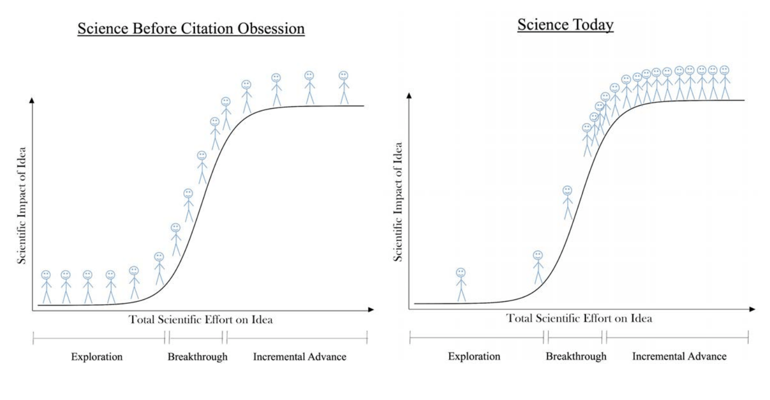 As for science, here’s an interesting drawing from a paper by Jay Bhattacharya and Mikko Packalen,[3] that Jason Crawford talked about a while back.