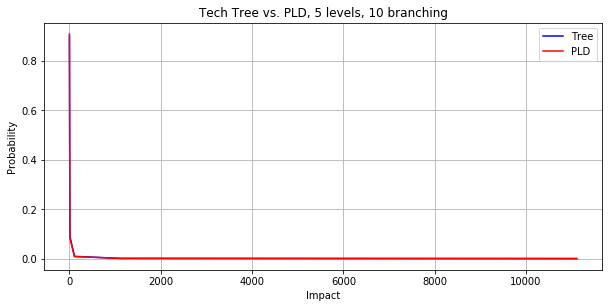 Here is a chart of the probability distribution of impact for the above tech tree, compared to a power-law (ie. Zipf) distribution.