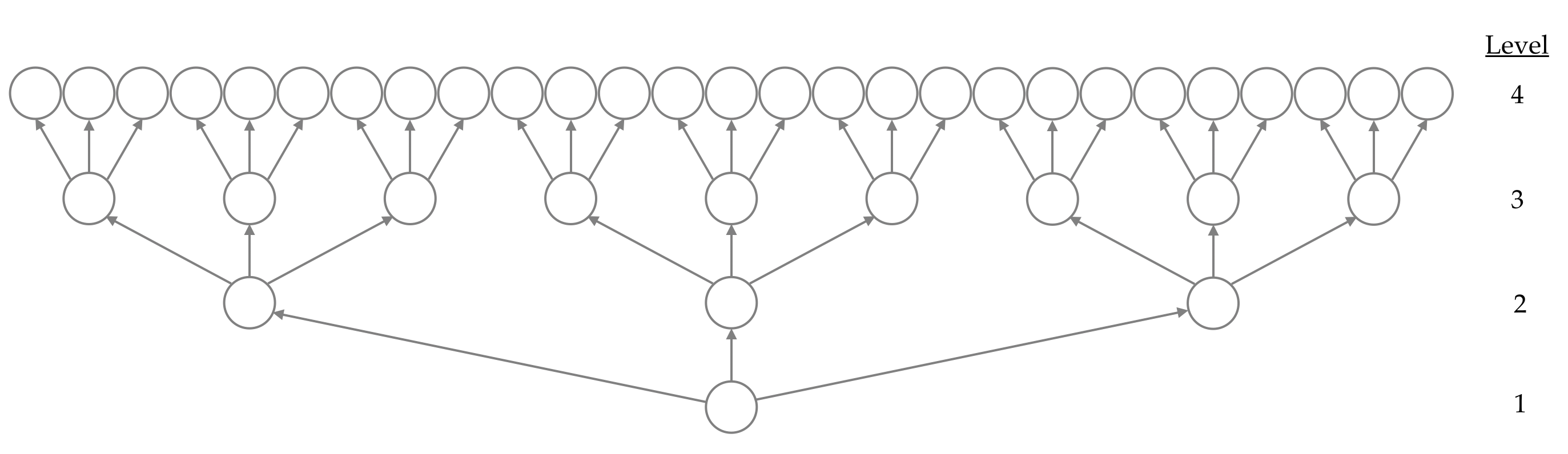 The impact of a change in a given technology depends on how deep it is in the tree. If the change happens to be in level 4 of the above tree, the only effect is on the technology that changed...no other technology relies on it. We will call this an impact of 1. If it is in level 3, it affects the technology that changed and those immediately above it, that rely on it, for a total impact of 4.