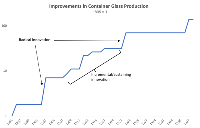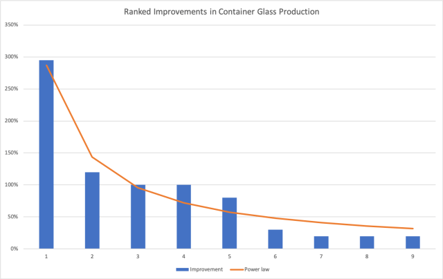 With commercial technological innovation we can often measure a new technology’s impact: if a technology is created to improve the throughput of a factory, we can measure the factory’s productivity change. What does the data show? Here’s a chart I used to illustrate the size of technological change in a previous post. This is real data on the productivity of a container glass factory showing improvements due to technological change.