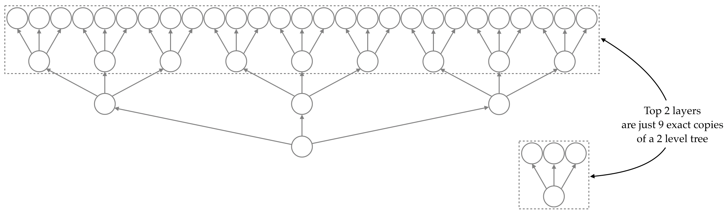 This is a model, of course, and it has many failings. One is that it assumes a regular tree. I believe this to be a small problem in the scheme of things for some fairly intuitive reasons. But intuitions can be wrong so more work needs to be done. A larger problem is the assumption that if there is a change at one level then the changes in the levels above just happen automatically. This is obviously not true: an innovation in lithography may allow innovations in semiconductor manufacturing and then in microprocessors, but somebody has to do that work too. And much of that work is also innovation in itself.