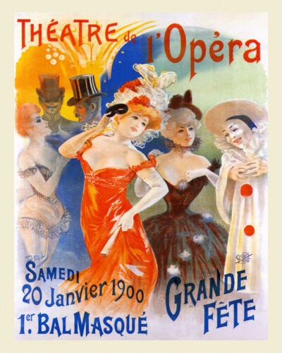 Like most visions of the future from a long time ago, the aesthetic predictions look hilariously wrong. But they would not have been out of place at the turn of the 20th century. Compare the fashion of the men and women above to those in the real poster for an opera event, below, from 1900: