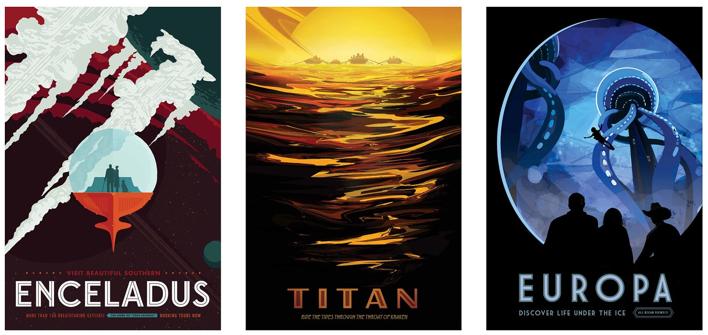 NASA understood this well. Two of the examples cited in Andy’s tweet are posters from their Visions of the Future series, which repurpose the style of vintage tourist ads to imagine what it would be like to visit other moons and planets. I cannot emphasize enough how original and inherently futuristic these posters are. They are well-made remixes of (several!) old styles with forward-facing ideas. They’re awesome; I even once printed two of them to hang in my apartment.